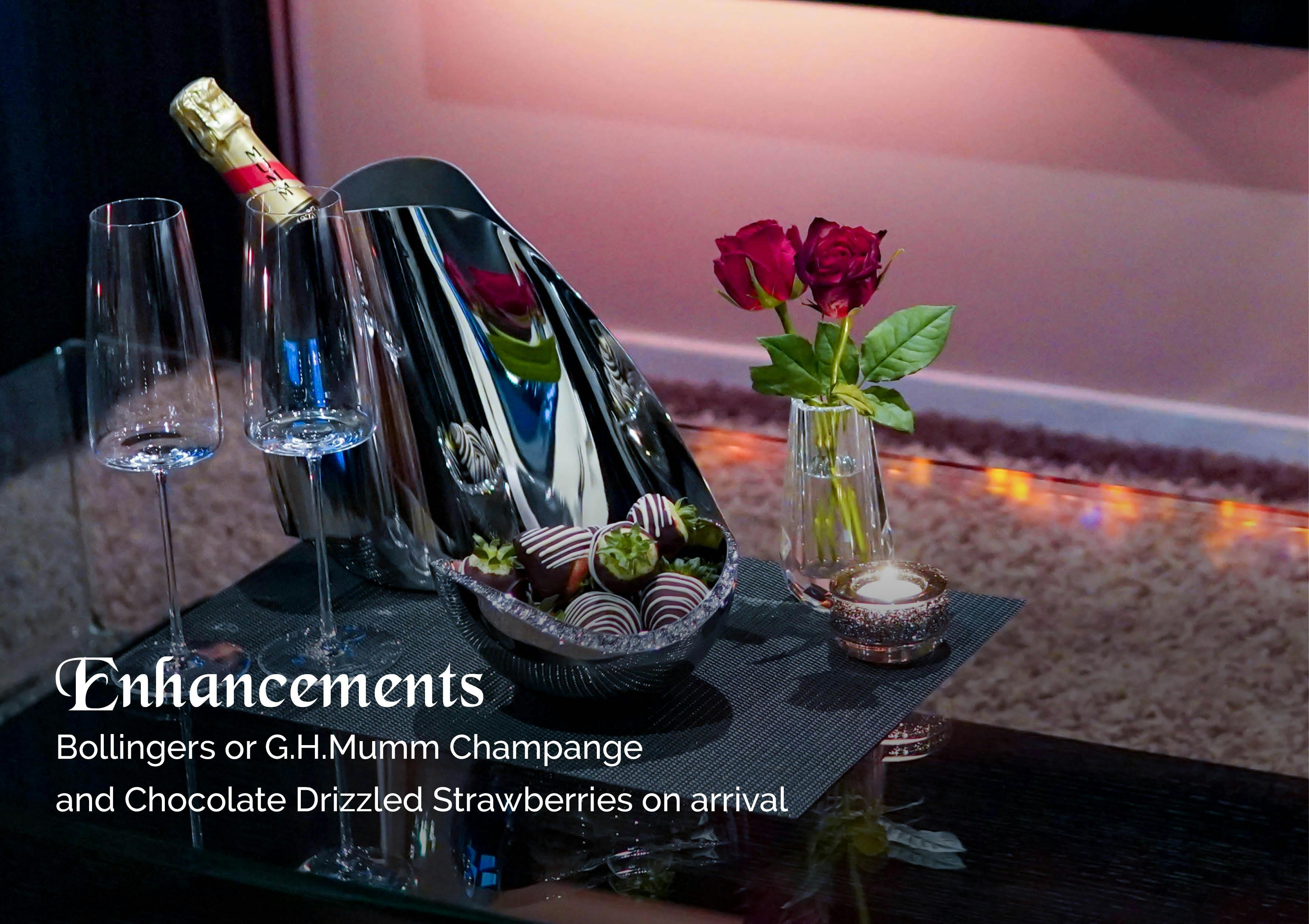 Bollingers or G.H.Mumm Champagne & Chocolate Drizzled Strawberries on arrival