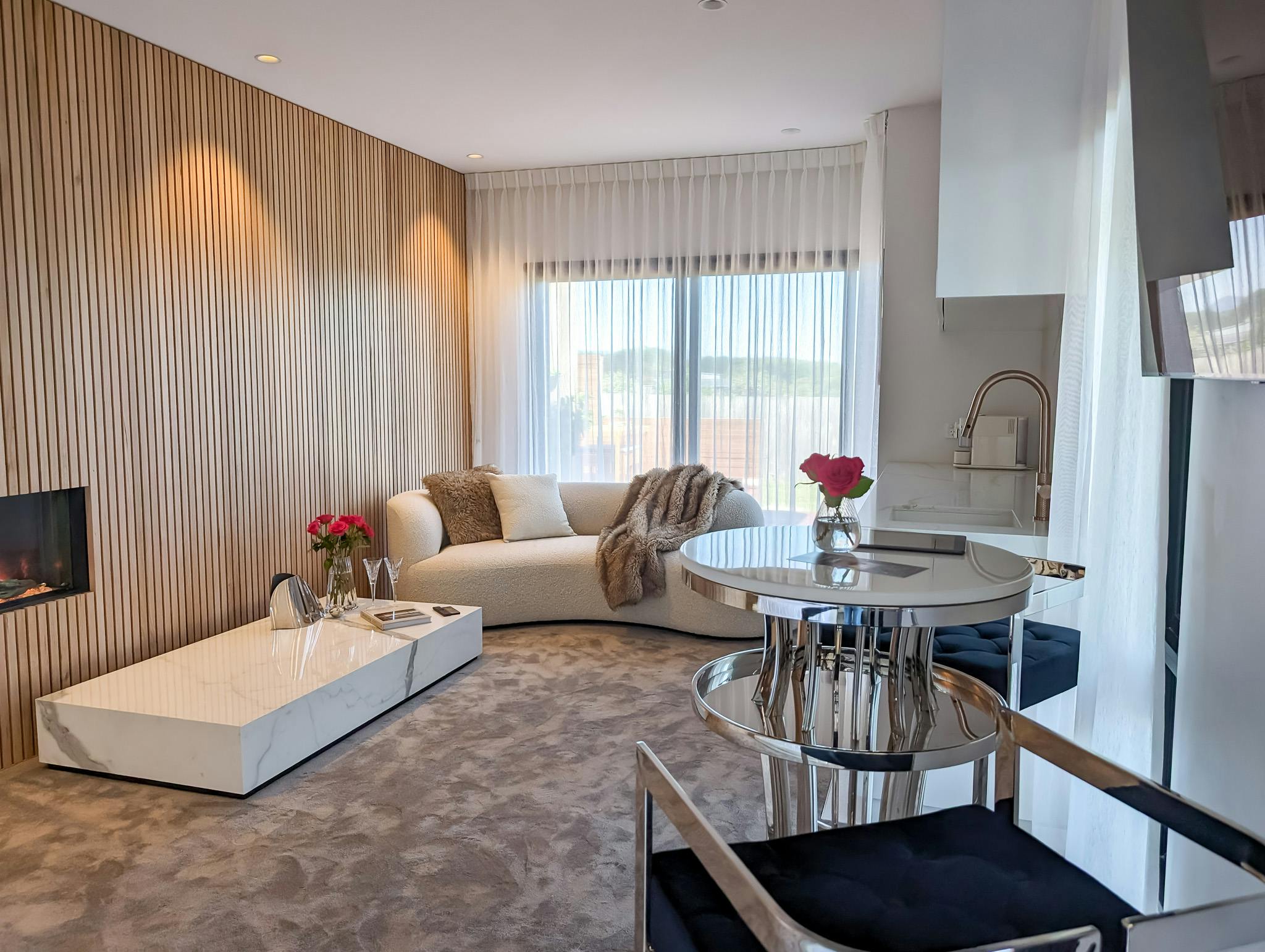 Our Signature Deluxe Suite, a haven where romance intertwines with luxury to create an enchanting escape. As you enter, let the flickering allure of an inviting fireplace set the stage for intimate moments, casting a warm glow upon the meticulously designed space. The Tas Oak curved wall guides you through your room, melding seamlessly with the opulence of carefully curated design.